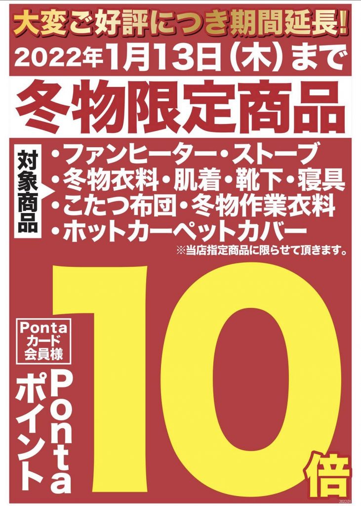 ご好評につき期間延長!! 2022年1月13日(木)まで 冬物限定商品Pontaカード会員様ポイント10倍!! 【対象商品】 ファンヒーター・ストーブ・冬物衣料・肌着・靴下・寝具 こたつ布団・冬物作業衣料・ホットカーペットカバー ※当店指定商品に限らせて頂きます。 ぜひ、この機会にニシムタ各店舗をご利用下さいませ。 皆様のお越しをお待ち致しております。