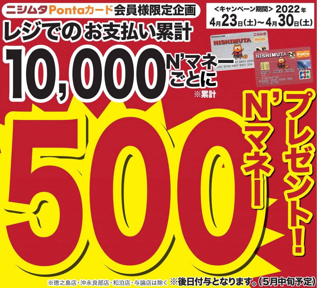 ニシムタPontaカード会員様限定特別企画 4月23日(土)より4月30日(土)までの期間中、 累計10,000N’マネー払いごとに500N’マネーボーナスを還元! ※付与日は5月中旬頃の予定となります。 ぜひ、この機会にN’マネーをご利用下さいませ。 皆様のお越しをお待ち致しております。