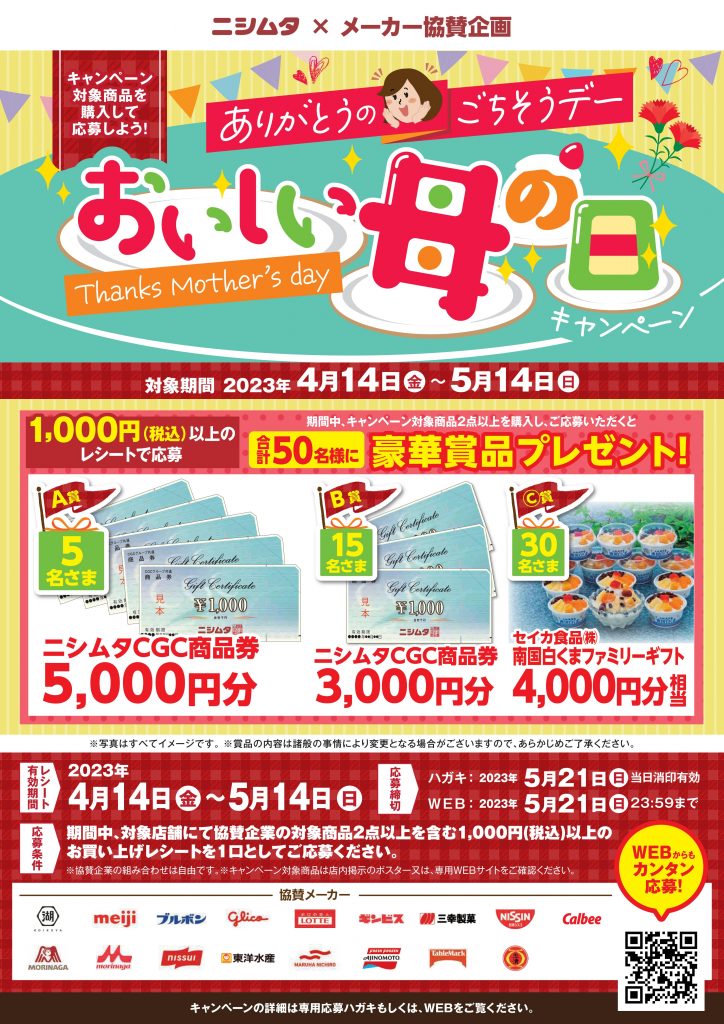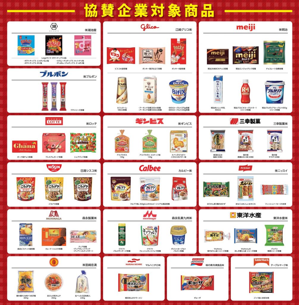 対象のニシムタ店舗にて協賛企業の対象商品2点以上を含む1000円(税込)以上のお買上げレシートを1口としてご応募下さい!