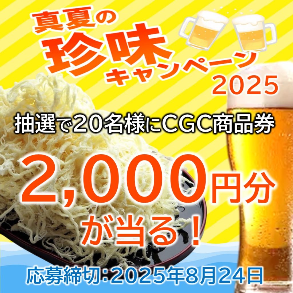 ??真夏の珍味キャンペーン2025開催中??対象の【よりどり3パック1,000円(税込1,080円)】商品をご購入で、?抽選で20名様に【CGC商品券2,000円分】が当たる?