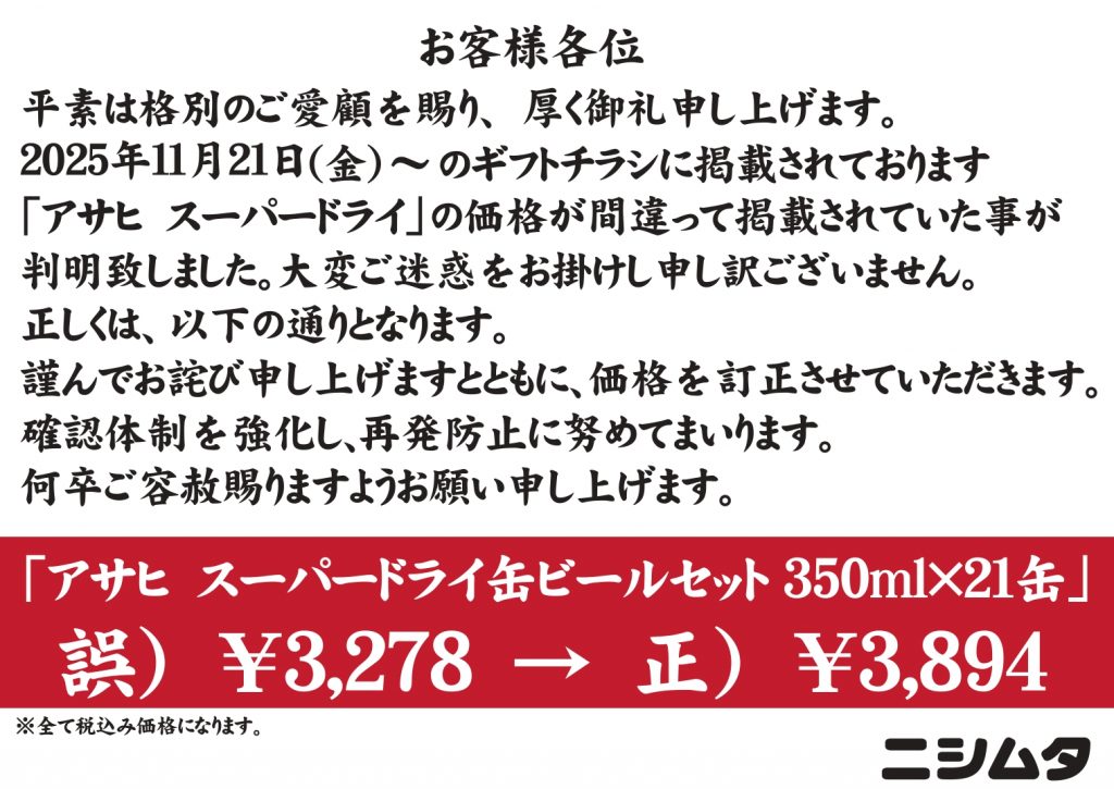 ギフトチラシ掲載価格誤表記のお詫びと訂正