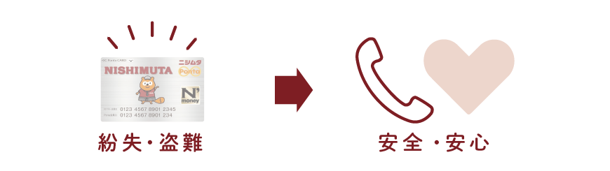 電話1本でN’マネー利用を一時停止することができます。紛失した場合、N’マネー残高は次のカードへ移行できます。